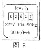 23.小明家用的电能表如图9所示,有一次家里只使用电饭锅做饭时,小明观察到电能表的表盘转动了120转,则做饭消耗的电能是_____________;1度电可供标有“PZ220-40”的电灯正常发光_____________小时。