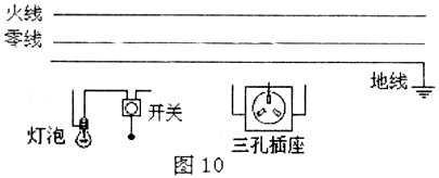 25.请用笔画线代替导线,将图10中连有开关的电灯和三孔插座接入家庭电路中。
