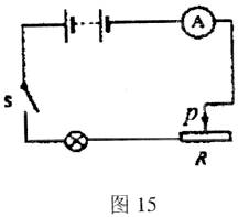 25、要把一只额定电流为0.2安的小灯泡接入电压恒定为9伏的电源两端,为安全起见,将小灯泡与一个滑动变阻器串联后接入电路,如图15所示,并关闭合后,移动滑片,当滑动变阻器消耗的功率为1.04瓦,小灯泡恰好正常发光。