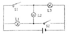9、如下图当开关S1、S2断开时,灯L1、L2和L3之间是 联,当S1、S2闭合时,灯L1、L2和L3之间是 联,当S1断开,S2闭合时,灯 亮。