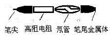24.测电笔(如图)是经常使用的工具之一,可用来判别照明电路的火线和零线。它的内部构造是一只有两个电极的灯泡,泡内充有氖气,俗称氖泡,它的一极串联一只高阻值电阻后接到笔尖,另一极连到笔的另一端。当氖泡的两极间电压达到一定值时,两极间便产生辉光。对测电笔的正确使用方法是,笔尖接触待测物体,用手接触笔尾金属体,与人体形成回路。已知人体的电阻约为5000Ω,对人体的安全电流约为8mA。若用笔尖接触照明电路火线,氖管发光: