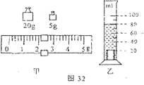 35.(3分)为了测量金属块的密度,将它放在调节好的天平上称量。当天平平衡时,放在右盘上的砝码和游码的位置如图32甲所示,此金属块的质量是 g;把金属块放入盛有70ml水的量筒中,量筒中的水面到达的位置如图32乙所示,此金属块的体积是 cm3。由此可知金属块的密度是 kg/m3。