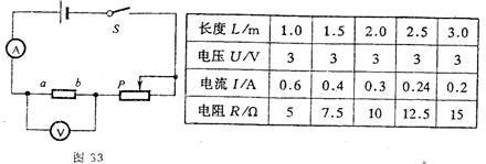 36.(3分)培英学校科技小组的同学们在研究某种新材料的导电性能强弱时,认为该材料制成的导体的电阻可能与它的长度有关。为了证明这种想法,他们设计了如图33所示的实验电路,并将一根粗细均匀的这种材料剪成长度不同的5段进行了实验,实验记录和数据处理结果见下表: