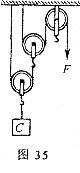 38.(1分)如图35所示,物体C重100N,在不计摩擦和绳重的情况下,要匀速提起重物时,需加力F为28N,若滑轮的规格都相同,则每个滑轮的重为 N。