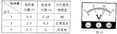 39.(2分)在做“测定小灯泡功率”的实验时,第一组和第二组同学分别选用了除小灯泡外规格均相同的实验器材,小灯泡的额定电压可能是“2.2V”、“2.5V”或“3.8V”。第一组同学正确连接好电路,闭合开关后记录了第l组数据;调节滑动变阻器,使小灯泡正常发光,此时记录了第2组数据;把滑片移到端点时小灯泡闪亮一下,然后熄灭,并记录了第3组数据,如下表所示,则第一组同学所用小灯泡的额定功率为 W。当第二组同学所选用的小灯泡正常发光时,电压表的示数如图36所示,而滑片恰好在滑动变阻器的中点上,则第二组同学所选用小灯泡的额定功率为 W。