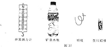 40.(2分)小明同学想测定他过生日时所点的彩色生日蜡烛的密度,手边只有一个弹簧测力计,他想了想,找来了一个矿泉水瓶、一段细线,如图37所示.小明利用自来水,很快就测出了蜡烛的密度.请你说出他的办法,写出实验步骤和彩色蜡烛密度的表达式。