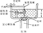 43.(5分)有一种厕所便桶水箱结构如图38所示(图中略去了向水箱中注水的装置),出水口上的橡胶盖是空心的。放水时橡胶盖浮起,水从出水口流出,随着水的流出,水面降低,直到橡胶盖盖住出水口,放水过程结束。注水过程中和注满水后,橡胶盖都盖住出水口,盖紧时橡胶盖上表面与池底相平。若水箱内水面高h是20cm,空心橡胶盖的上表面面积是70cm2,橡胶盖和连杆的总质量为l00g,总体积是l50cm3,橡胶盖内部空心体积为40cm3,固定轴到尼龙绳头的距离OB是25cm,手柄左端到固定轴的距离AO是15cm(AB杆和尼龙绳的质量不计),试求: