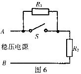 17.如图6所示,为保温电饭锅的电路示意图,R1、R2为两电热丝,S为温控开关,A、B两点接在稳压电源上,R1∶R2=9∶1,加热时的功率为1000W,则
