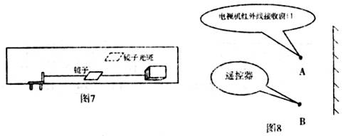 23.(3分)徐风同学偶然发现电视机的遥控器对准光滑墙壁,有时也可以控制电视机。她查阅了相关资料知道摇控器发出一种不可见光,叫红外线。遥控器是用它来控制电视机的,请你帮助徐风在图8中画出遥控器通过光滑墙壁控制电视机的光路图。