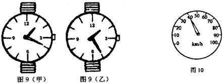 25.国庆节期间小文乘车去旅游,通过前方隧道时,他想测出隧道的长度,于是在进、出隧道口时,分别看了一下手表,如图9甲、乙所示,汽车通过隧道前后司机座位前面的速度计的指针如图10所示,假设汽车匀速运动,请计算此隧道的长度为多少km。(10分)