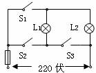 15.图中所示电路中,L1和L2分别为“220V 15W”和“220V 40W”的白织灯泡,为了使L1、L2都发光,且L1比L2亮,应闭合的开关为________.当开关_______闭合时,保险丝会被熔断.
