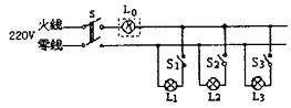 6.工人师傅常用一只标有“220V 400W”的灯泡L0(检验灯泡)取代保险丝来检查新安装的照明电路中每个支路的情况。如下图所示,当只闭合S、S1时L0不亮;当只闭合S、S2时L0和L2都呈暗红色;当只闭合S、S3时L0正常发光。由此可判断( )