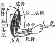 3.下图表示人的肱二头肌收缩使前臂曲肘时的情况,图中已标出了支点的位置、桡骨及茶杯的受力方向。人的前臂是一个 杠杆,这种结构带来的好处是 。
