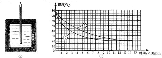 36.小王同学做“比较两种材料保温性能”的实验,他取①和②两种保温材料,两支相同的温度计,两个相同的大玻璃烧杯,钟表和初温相同、质量相等的热开水,以及细线、硬纸片、剪刀等,做两个外形相同的保温装置,其中一个如图(a)所示.然后在相同环境的房间里同时开始做实验.他根据实验测得的数据绘得图(b)所示的“水温与时间关系”图像.实验过程中室温保持不变,请你回答: