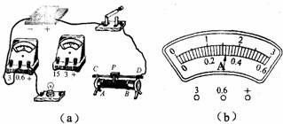 (3)为测量灯泡的额定功率,应调节_____________,并同时注意观察___________;当确认灯泡正常发光时,电流表的示数如图(b),其读数为__________,该灯泡的额定功率是___________________。