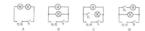 27.投影机的光源是强光灯泡,发光时必须用风扇给它降温.现想设计投影仪的电路,要求:带动风扇的电动机先启动后,灯泡才可以发光;电动机未启动,灯泡不可以发光.下图中符合设计要求的是 ( )