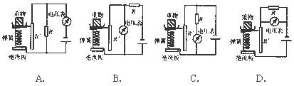 12.小明同学设计了如图中所示的四种用电流表或电压表显示测量重物重力大小的电路,其中R′是滑动变阻器,R是定值电阻,电源两端的电压恒定. 四个电路中有一个电路能实现重物所受重力增大,电表示数增大,这个电路是 ( )