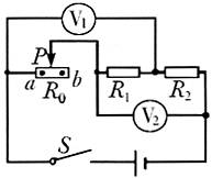26.下图所示电路,电源两端电压 U 保持不变,当滑动变阻器滑片P从a点向b点移动的过程中,两只电压表V1、V2的示数变化的绝对值分别为△U1、△U2。Rmin为滑动变阻器的最大阻值,且Rmax<R1<R2,则确定△U1和△U2的大小关系是:___________________。