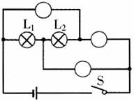 (2)下图所示,请在图中的“○”内填入电流表或电压表的符号,(有两个电压表、一个电流表)。当闭合开关 S 后,灯L1与L2都能发光。(1分)