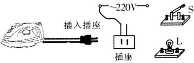 33.小丽观察发现:邻居裁缝店的电熨斗连接着一个白炽灯L(灯泡的电阻较大),如下图所示,当闭合开关S时,电熨斗处于高温熨烫状态,灯L不发光;当断开开关S,电熨斗保持低温状态,灯L发光。请你用笔画线代替导线把该电路连接完整。(2分)