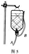 3.图5所示的是医院为病人输液时用的吊瓶,瓶中插入两条管子,A管是输液管、B管是空气管。在输液的过程中,如果发现病人的血液沿输液管回流,可将吊瓶适当地升高,血液就会随着药液重新流入患者的血管而不再回流。这是因为当吊瓶升高后,增大了流入患者血管药液的 ,阻止了血液的流出。B管的作用是 。