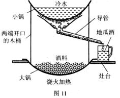 5.我国南方某些地区有用“番薯、酒曲、水”做原料酿造“地瓜酒”的习俗。首先将番薯煮熟,晾到一定的温度后,把“番薯、酒曲、水”按一定比例混合并搅拌均匀,经发酵40天左右,其间每天搅拌一、二次;最后在“酒料”中分离出“地瓜酒”。图11是从“酒料”中提取“地瓜酒”的装置示意图。