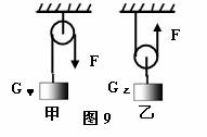 22、如图9,小红用同样大小的力把甲、乙两物体匀速提升,如不计摩擦和滑轮重,则甲、乙两物体重力的关系是G甲 G乙。