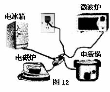 26、根据图12家庭用电的情景指出中两个不安全的地方。