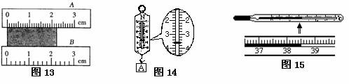 27、(5分)图13所示,用A、B两把刻度尺测同一物体长度,放置正确的是 刻度尺,其分度值是 ,该物体的长度为 cm;图14弹簧测力计的读数F= N;图15体温计的示数是 oC。