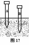 30、(4分)在探究“物体的重力势能与哪些因素有关”的实验中,二个完全相同的木桩A、B被从正上方静止释放的铁块撞击后陷入沙坑中的情况如图17所示。