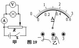 32、(4分)在“测量小灯泡电功率”的实验中,用电压表、电流表、滑动变阻器、直流电源和一只灯泡组成如图19(甲)电路,已知电源电压为4.5V,小灯泡的额定电压为3.8V,灯丝电阻约为10Ω。