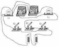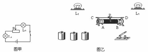 26.图中所提供的实验器材, 应怎样连接才能使L1和L2两灯串联在电路中, 并用电流表测L1的电流, 用电压表测L2两端的电压: (1)、 画出它的电路图。 (2)、 在图中用笔画线表示导线, 连接好实物电路。
