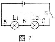 18.如图7所示的电路中,电源电压为6V,小灯泡L1、L2的规格相同.当闭合开关S后,发现两灯都不亮,用电压表检查时,测出A、B两点之间的电压为零,B、C两点之间的电压为6V,则故障原因可能是____________________。