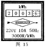 28.一天晚上,小明发现家中的电灯比平常暗了许多,他猜想可能是家庭电路中电压过低的缘故,为了证实这种猜测,他做了如下实验:关闭家中其他用电器,只开一只“220V,100W”的电灯,观察到如图15所示的电能表在5min内转了20圈.求:
