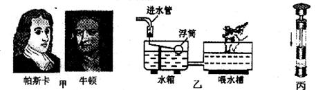 9.(4分)如下图乙所示,是某个养牛场自动喂水器的装置原理图。从图中可知,喂水槽和水箱构成了一个___________,当乳牛饮水使喂水槽中的水面下降时,水箱中的水面变化情况是___________。浮筒位置随之发生变化,与浮筒相连的实际上是一个杠杆,根据___________原理,杠杆另一端将进水管的阀门向下打开,进水管开始放水,浮筒由于受到___________的作用,随水面一起上升,直到将进水阀门关闭。