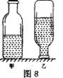 11.如图8所示,瓶中装一定量的水,竖直放置时(图甲),水对瓶底的压强为PA;若将它竖直倒置(图乙),水对瓶盖的压强为PB,PB>PA,原因是 。