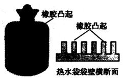 16.人们用来取暖的一种热水袋如图所示。它的表面有很多长条状的橡胶突起部分,这些突起部分相互平行且突起的高度较大,做成这种外形的目的是什么?(4分)