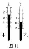 21.小明在学习了温度计的使用后,利用温度计测量了某天不同时刻的气温,如图11甲、乙所示,则甲温度计的示数为 ℃,乙温度计的示数为 ℃。