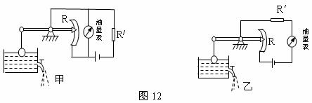 22.如图12甲、乙所示,是自动测定油箱内油面高度的装置,R是滑动变阻器,它的金属滑片是杠杆的一端。油量表分别是由电压表和电流表改装而成,则由图可知甲图中的油量表是 表,乙图中的油量表是 表;仔细分析电路你可以发现图 中电表的示数变化与油量的变化情况不一致。要使电表示数的变化与液面变化一致,应如何改动?请在原图上标出。