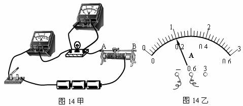 (3)排除故障后,若实验中发现电压表示数为2V,则应将滑片向___________端方向移动才能使小灯泡正常发光(填“A”或“B”).当小灯泡正常发光时电流表示数如图14乙所示,此时通过小灯泡的电流表示数是_______A,小灯泡的额定功率是________W.