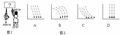 5、如图1所示装置,若女孩用60 N的力把绳子匀速拉出5 m ,重300 N的男孩被匀速举高0.5 m,这个盒子内机械的机械效率是