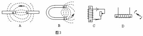 8、小刚学习了磁的知识后,标出了下列四种情况下磁体的磁极(小磁针的黑端为N极)如图3所示,其中正确的是