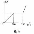13、有一个阻值不变的电阻性用电器,要求当电源电压在210-230V范围内变化时,通过它的电流不变.于是设计人员研制了一个新型电子配件,与其串联接入电路,便满足了要求.组装后测试,电路中电流与电源电压的关系如图6所示.那么,对于电子配件来说