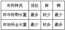 ⑶ 主要步骤:将三个烧杯中倒入________的水,分别将三块布放入各个烧杯中让水浸透,然后将三块布分别取出。从方便和准确的角度看,应观察和比较________。将现象记入下表。