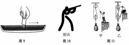 4.图10是2008年北京奥运会射击运动员射击比赛的图标,该图标生动地说明运动员要想击中靶心,都要闭上一只眼,然后让另一只眼和枪上的准星、靶心在同一直线上,这是利用了 的原理;如果枪膛长30cm,火药在枪膛内对子弹的推力是100N,子弹离开枪膛后前进了50m,则火药对子弹所做的功是 J。