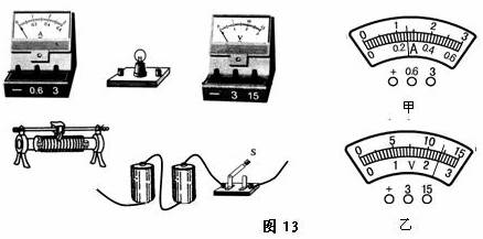 李明检查电路连接无误后,闭合开关,测得灯泡的电流和电压如图13甲、乙所示,则通过灯泡的电流是 A,灯泡两端的电压是 V。