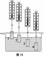 为了验证上述猜想,李明做了如图14所示的实验:他在弹簧测力计下端挂一个铁块,依次把它缓缓地浸入水中不同位置,在这一实验中: