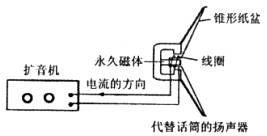 50.作为一种应急措施,有时也可以用扬声器代替话筒.如图所示装置,人对着扬声器的锥形纸盆说话,声音就会使与纸盆相连的线圈在磁场中振动,从而产生随着声音的变化而变化的 .这种现象在物理学上称为 现象.