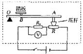 57.(8分)有一种测量人的体重的电子秤,其测量部分的原理如图中虚线框里的内容所示.它主要由四部分构成:踏板和压力杠杆OBA(可绕O点转动)、定值电阻R0、压力传感器R(其电阻值会随所受压力大小发生变化,变化关系如下表)、显示质量大小的仪表V(实质是一个量程为0-3 V的电压表).已知OB:OA=1:4,电源电压恒为3 V,忽略踏板、杠杆及压杆的重力,g取10 N/kg.