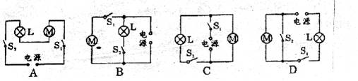 7、家用电冰箱的用电部分主要是电动压缩机和照明灯泡。其中,电动压缩机M受温控开关S1的控制,照明灯泡L受门控开关S2的控制,要求它们既能单独工作又能同时工作。图中是几个同学设计的家用电冰箱的电路图,其中符合要求的是